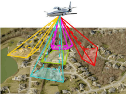 倾斜摄影技术,通过在同一飞行平台上搭载多台传感器(目前常用的是五镜头相机)。同时从垂直、倾斜等不同角度采集影像,获取地面物体更为完整准确的信息。垂直地面角度拍摄获取的是垂直向下的一组影像,称为正片,镜头朝向与地面成一定夹角拍摄获取的四组影像分别指向东南西北,称为斜片。 摄取范围如下图: