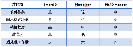 这几个建模软件也是各有优缺点,PhotoScan比较轻量级,但是生成的模型纹理效果不是太理想,Smart3D生成的三维模型效果最为理想,人工修复工作量较低,但是软件比较复杂不易上手且价格较高。