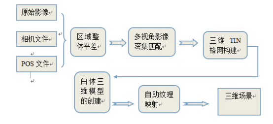 利用建模软件将照片建模,这里的照片不仅仅是通过无人机西藏航拍的倾斜摄影数据,还可以是单反甚至是手机以一定重叠度环拍而来的,这些照片导入到建模软件中,通过计算机图形计算,结合pos信息空三处理,生成点云,点云构成格网,格网结合照片生成赋有纹理的三维模型。区域整体三维建模方法生产路线图: