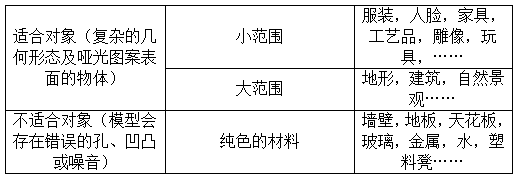 在实际的建模生产过程中,Smart3D 能够针对近至中距离的景物建模,也可以对自然景观的大场景建模,但最适用于复杂的几何形态及哑光图案表面的物体。下面简单列出了建模目标体的基本特征: